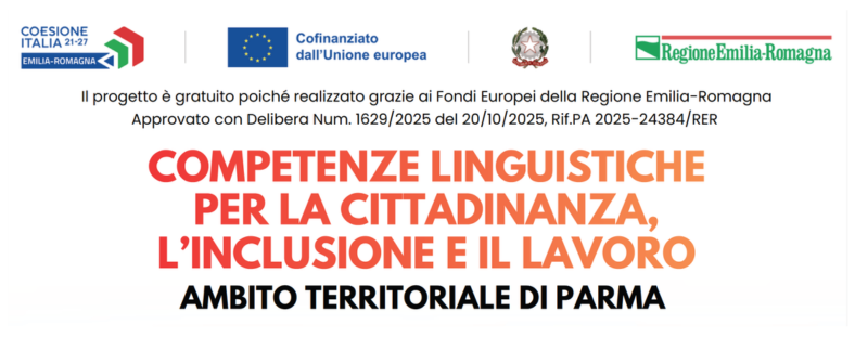 Operazione Rif.PA 2025-24387/RER COMPETENZE LINGUISTICHE PER LA PARTECIPAZIONE ALLA COMUNITÀ E PER L’ATTIVAZIONE VERSO IL LAVORO – AMBITO TERRITORIALE PARMA APPROVATA CON DGR N. 1658 DEL 20/10/2025 , REALIZZATA GRAZIE AI FONDI EUROPEI DELLA REGIONE EMILIA-ROMAGNA.