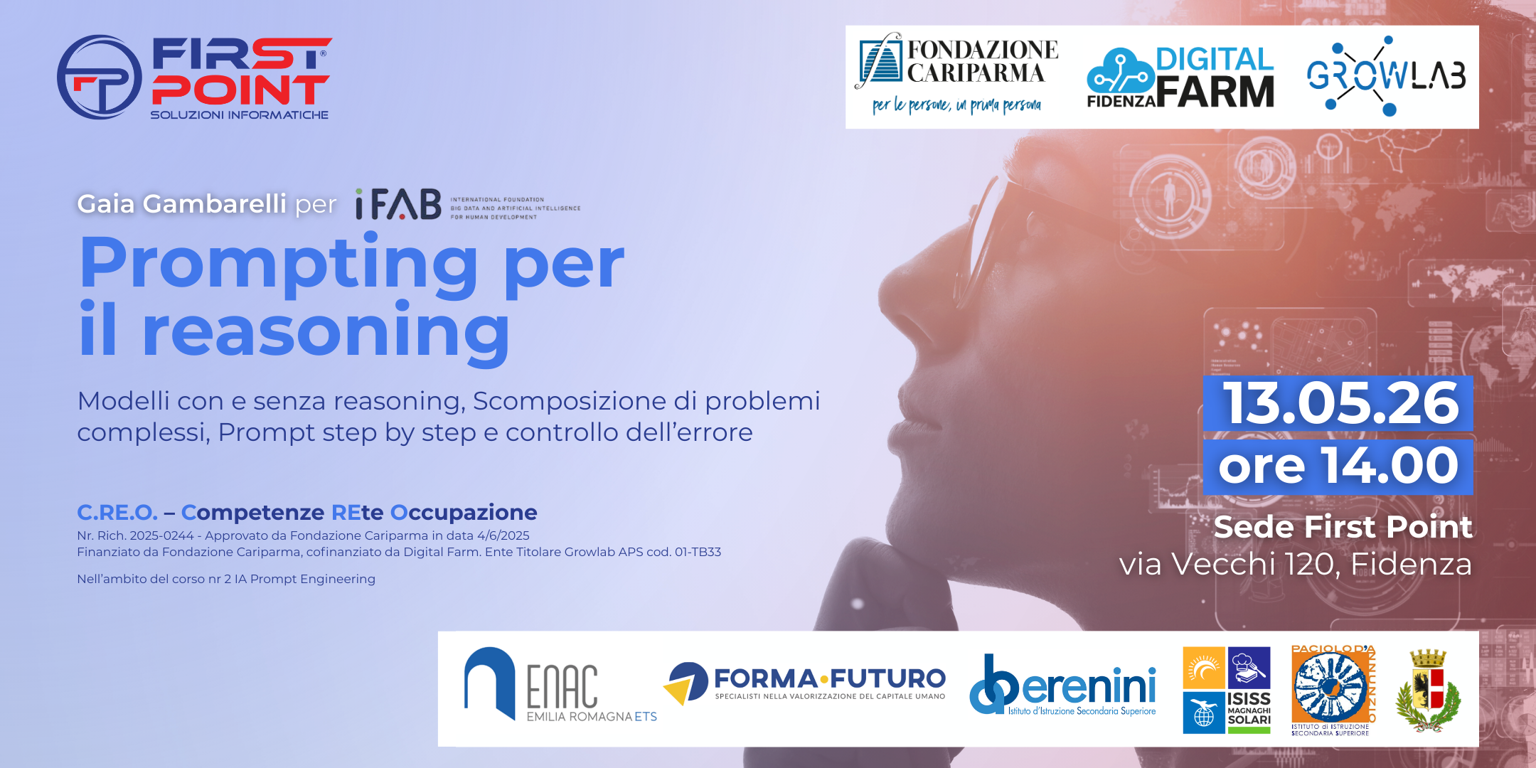 Due pomeriggi offerti insieme ad iFAB, presso la sede di FirstPoint a Fidenza (uno ad aprile e uno a maggio), nell’ambito delle iniziative gratuite del progetto C.RE.O.