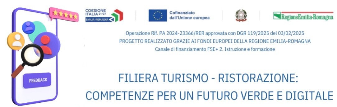 Operazione Rif. PA 2024-23366/RER approvata con DGR 119/2025 del 03/02/2025 PROGETTO REALIZZATO GRAZIE AI FONDI EUROPEI DELLA REGIONE EMILIA-ROMAGNA Canale di finanziamento FSE+ 2. Istruzione e formazione. FILIERA TURISMO-RISTORAZIONE: COMPETENZE PER UN FUTURO VERDE E DIGITALE